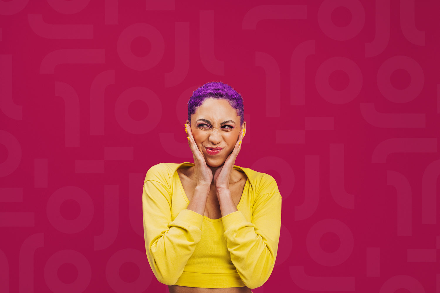 Being quirky in the studio. Playful young woman making a funny expression while standing against a pink background. Fashionable young woman wearing makeup with purple hair in a studio.