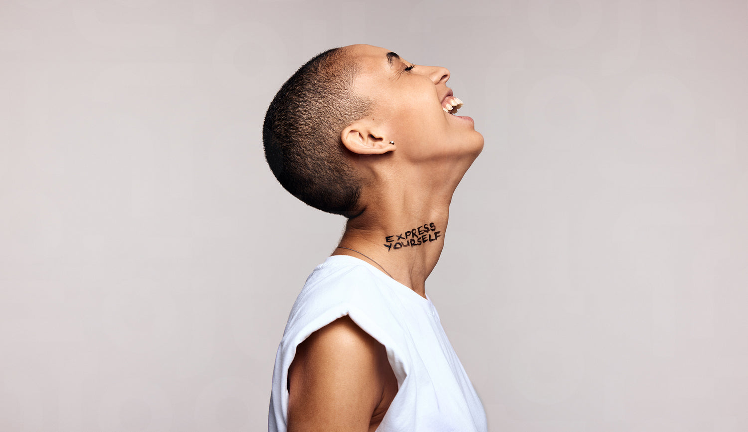 Side view of androgynous woman with a white top smiling. Happy woman with shaved head laughing, with express yourself written on her neck.