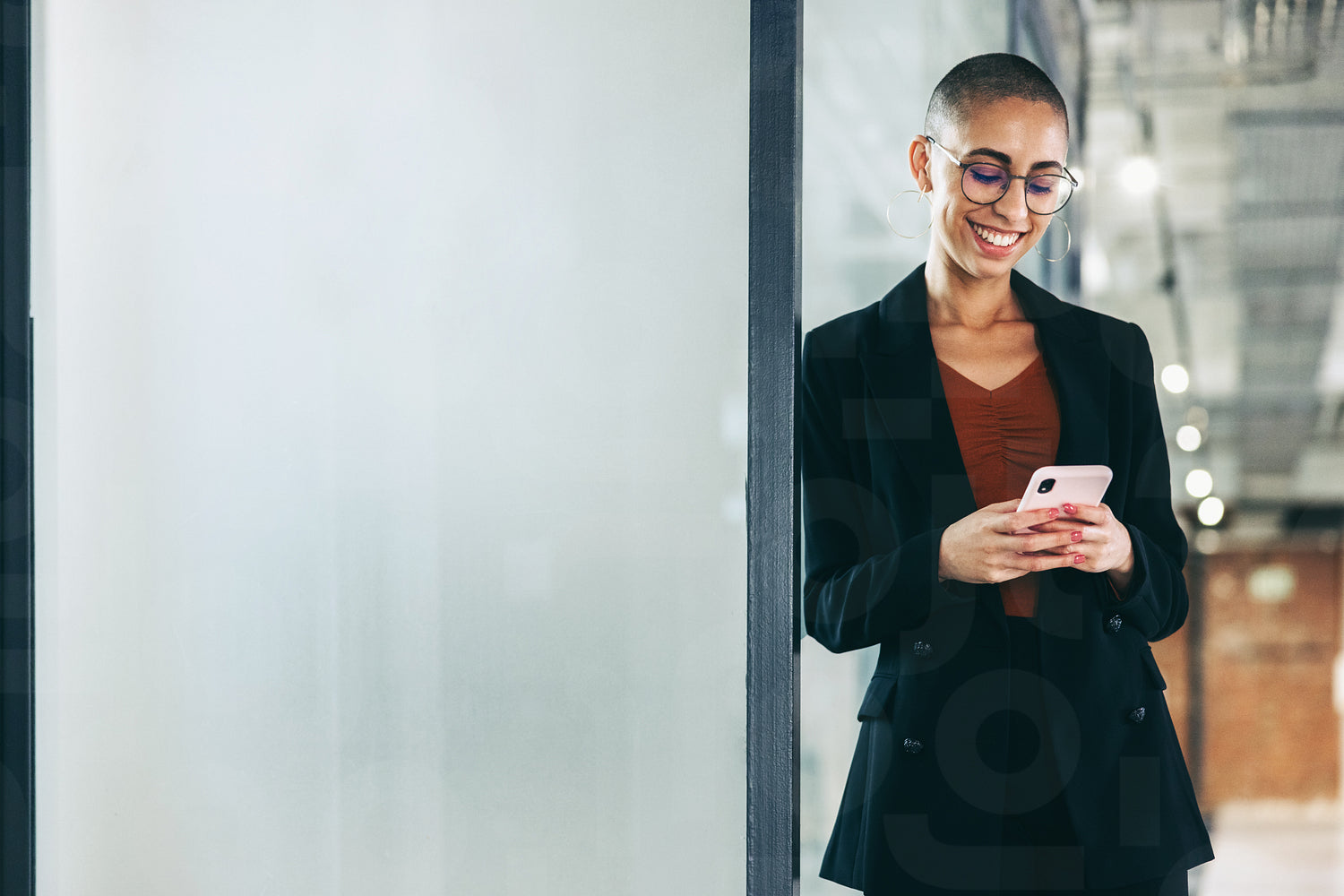 Successful businesswoman reading a text message in an office. Happy young businesswoman smiling cheerfully while standing in a modern workplace. Businesswoman communicating with her clients.