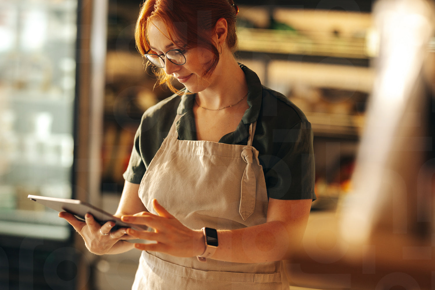 Cheerful supermarket owner using a digital tablet while standing in her grocery store. Successful entrepreneur running her small business using wireless technology.