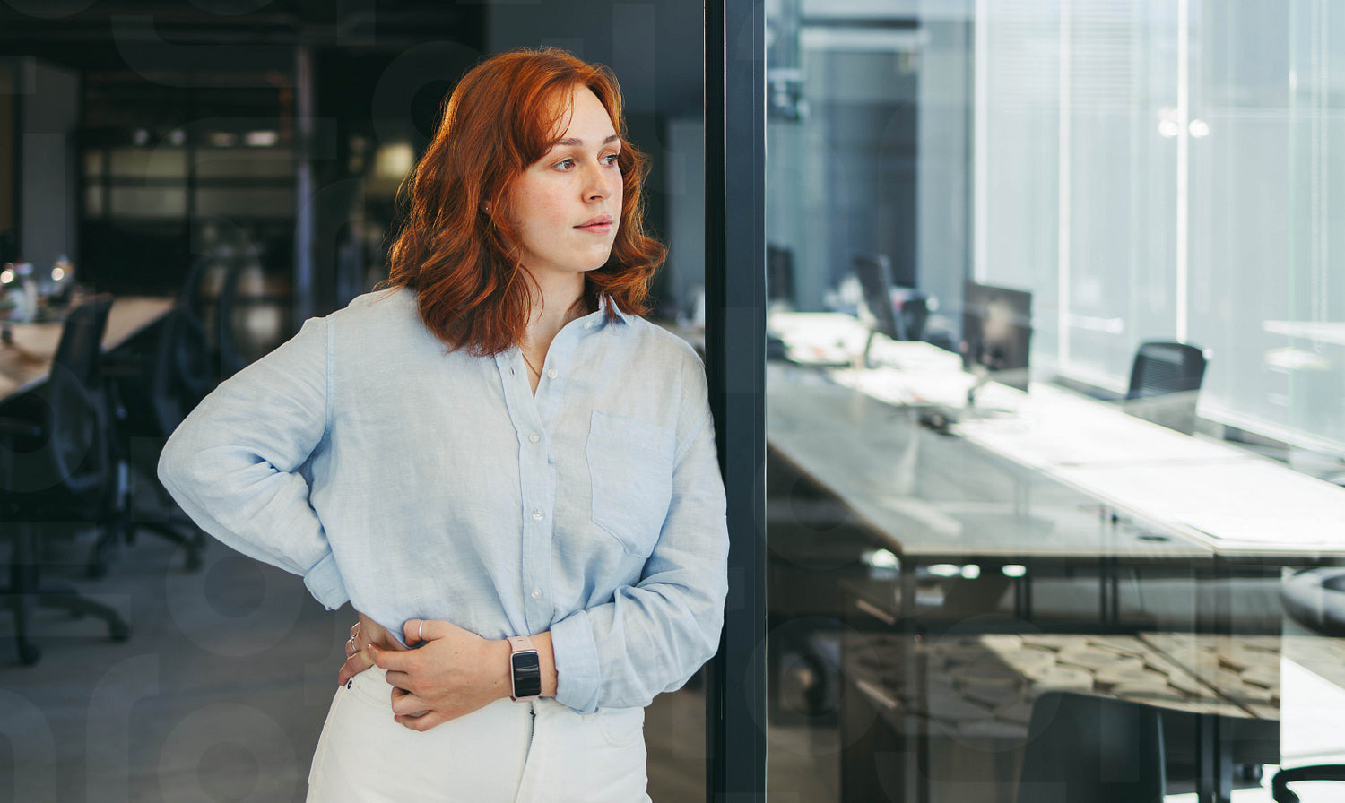 Businesswoman stands in a busy office, looking away thoughtfully. She is a professional employee, a pensive entrepreneur in a tech company. With her ginger hair, she exudes confidence and displays a contemplative demeanor.