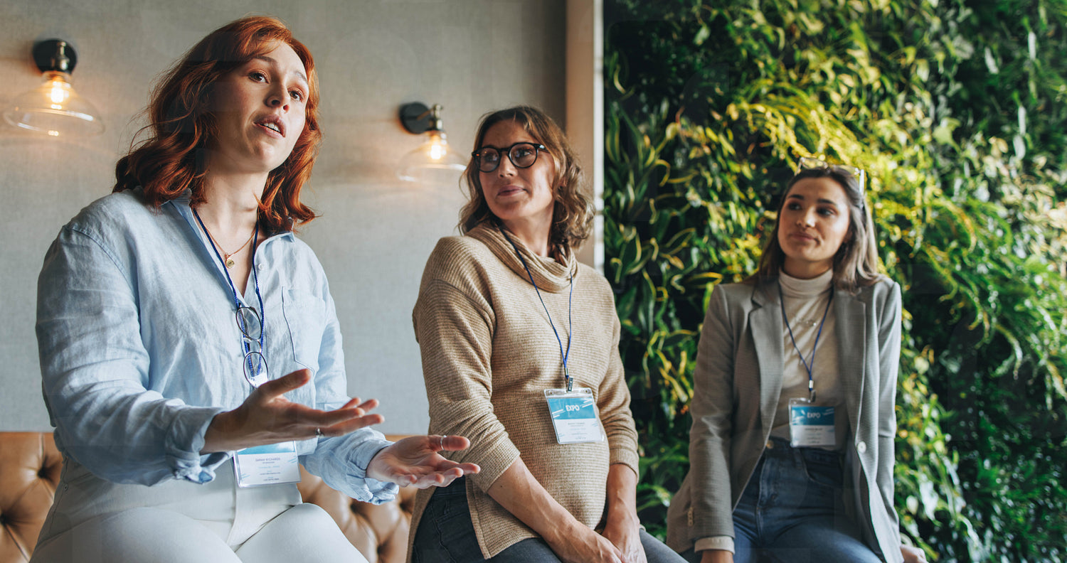 Female professionals engage in a business meeting, discussing work-related topics. The office setting showcases teamwork and collaboration among colleagues. This seminar promotes networking and idea exchange among young and experienced individuals in a vibrant workplace environment.