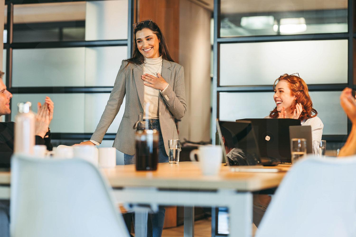 Business professionals, including business women, collaborate in a tech office. They engage in a lively discussion, applauding achievements. The leader fosters teamwork and creativity, inspiring success.