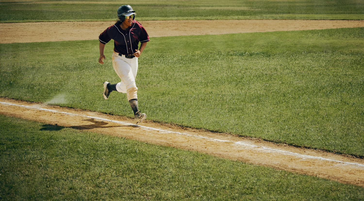 A dynamic shot of a baseball player acting as a base runner during a professional game, showcasing agility and intensity. This photo has intentional use of 35mm film grain.