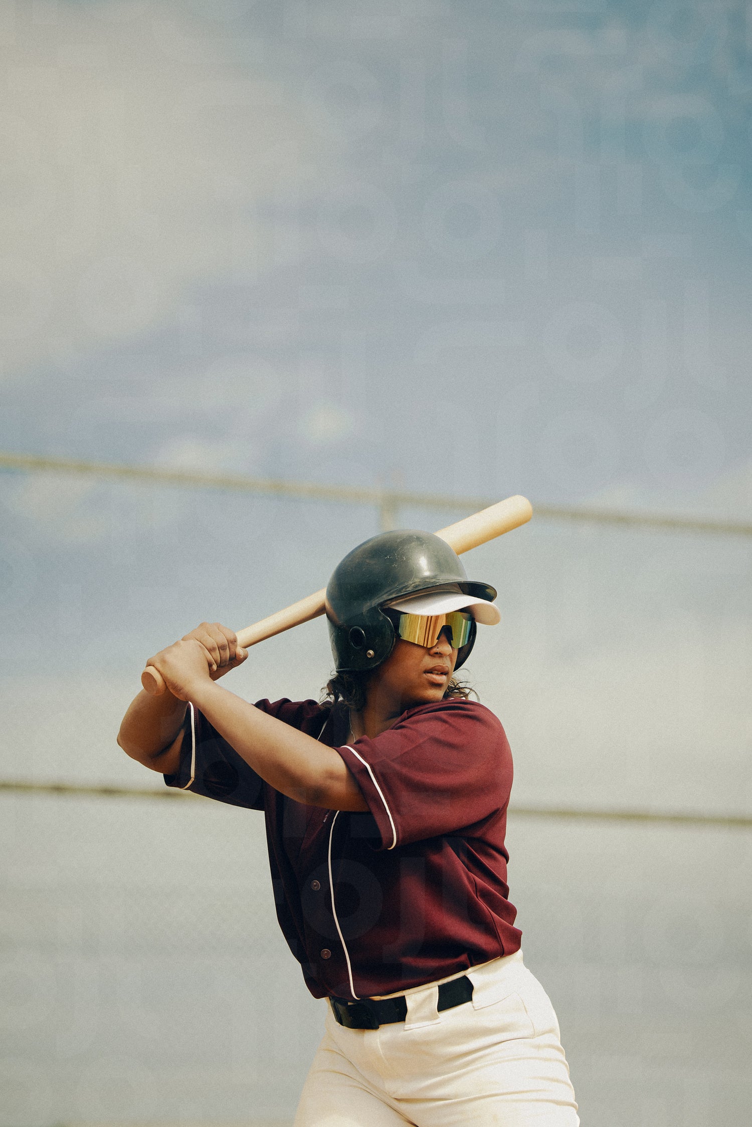 Athlete prepares for a powerful swing during baseball training, wearing a helmet and maroon uniform in outdoor setting. This photo has intentional use of 35mm film grain.