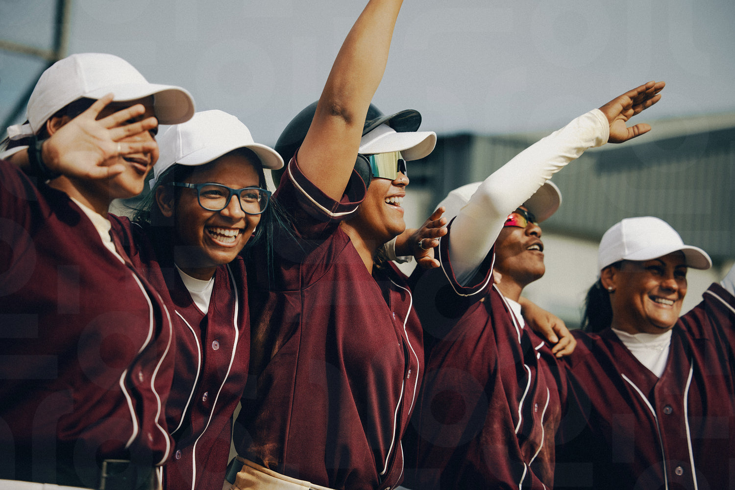 Joyful women's baseball team celebrates victory with enthusiasm, embracing team spirit and friendship on the field. This photo has intentional use of 35mm film grain.