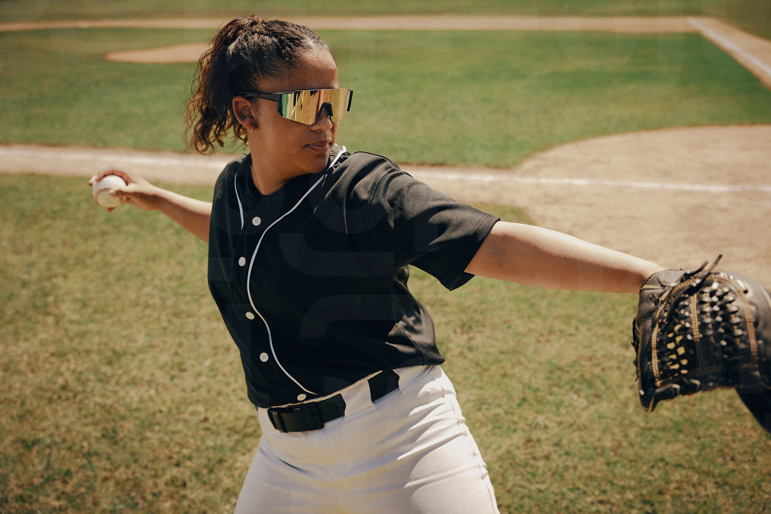 A female baseball player in a black jersey and sunglasses prepares to pitch on a sunny field, highlighting her determination and athletic skill. This photo has intentional use of 35mm film grain.
