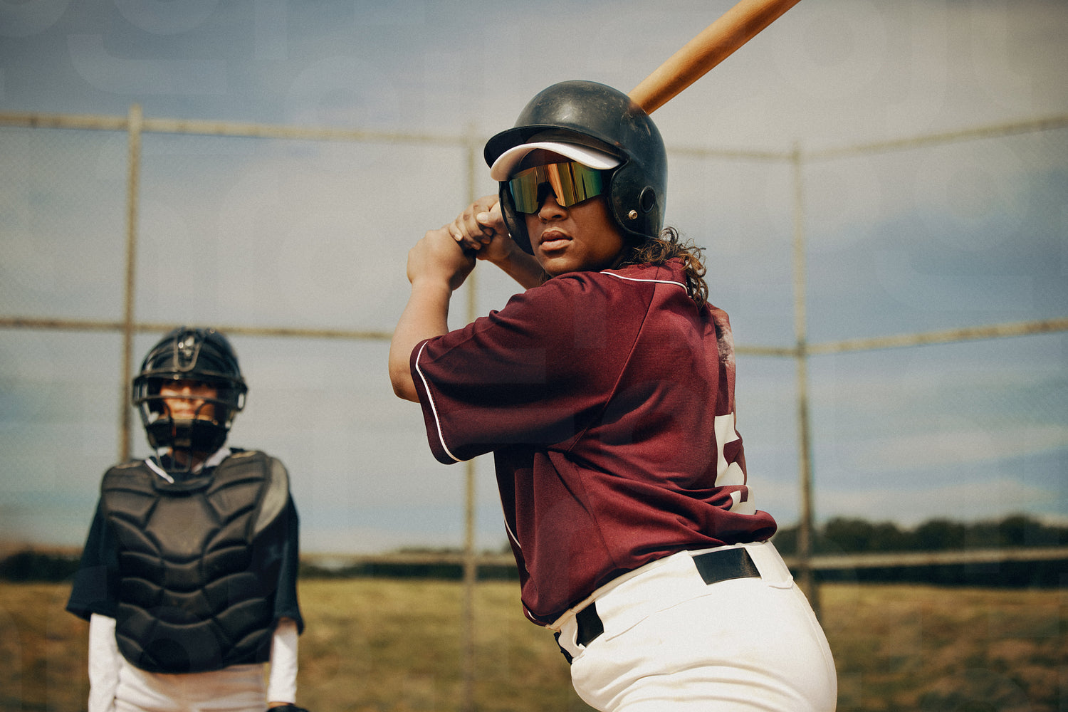 In this dynamic image, a female batter prepares to swing while the catcher stands ready. The scene captures the focus and determination on a sunny baseball field. This photo has intentional use of 35mm film grain.