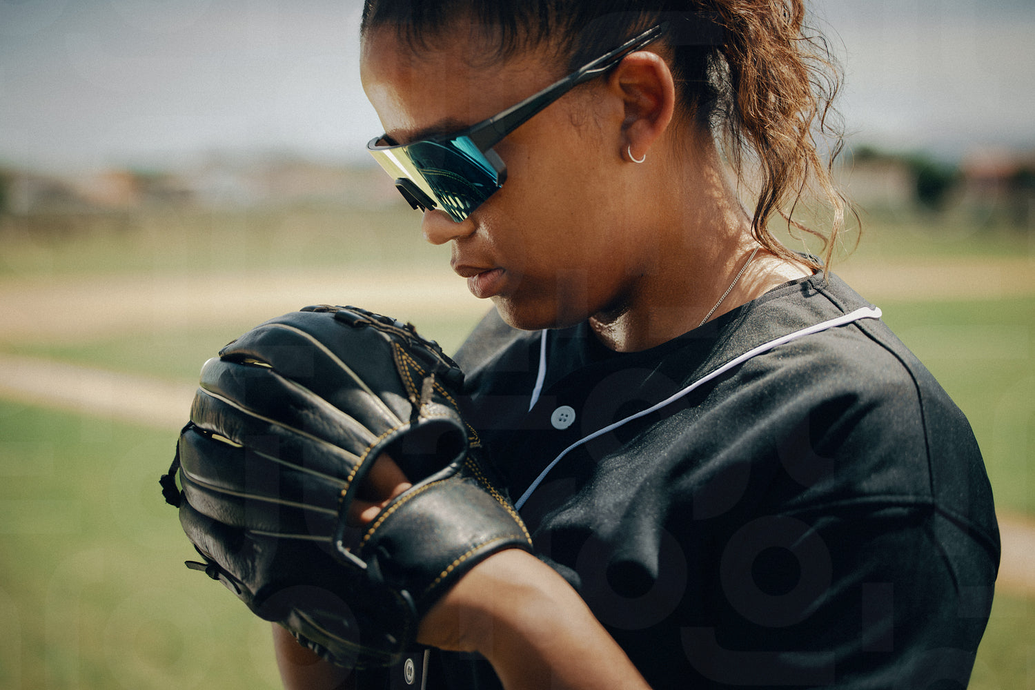 A tenacious baseball player with sunglasses intensely focused, holding a glove on a sunny field, showcasing professionalism and sports spirit. This photo has intentional use of 35mm film grain.