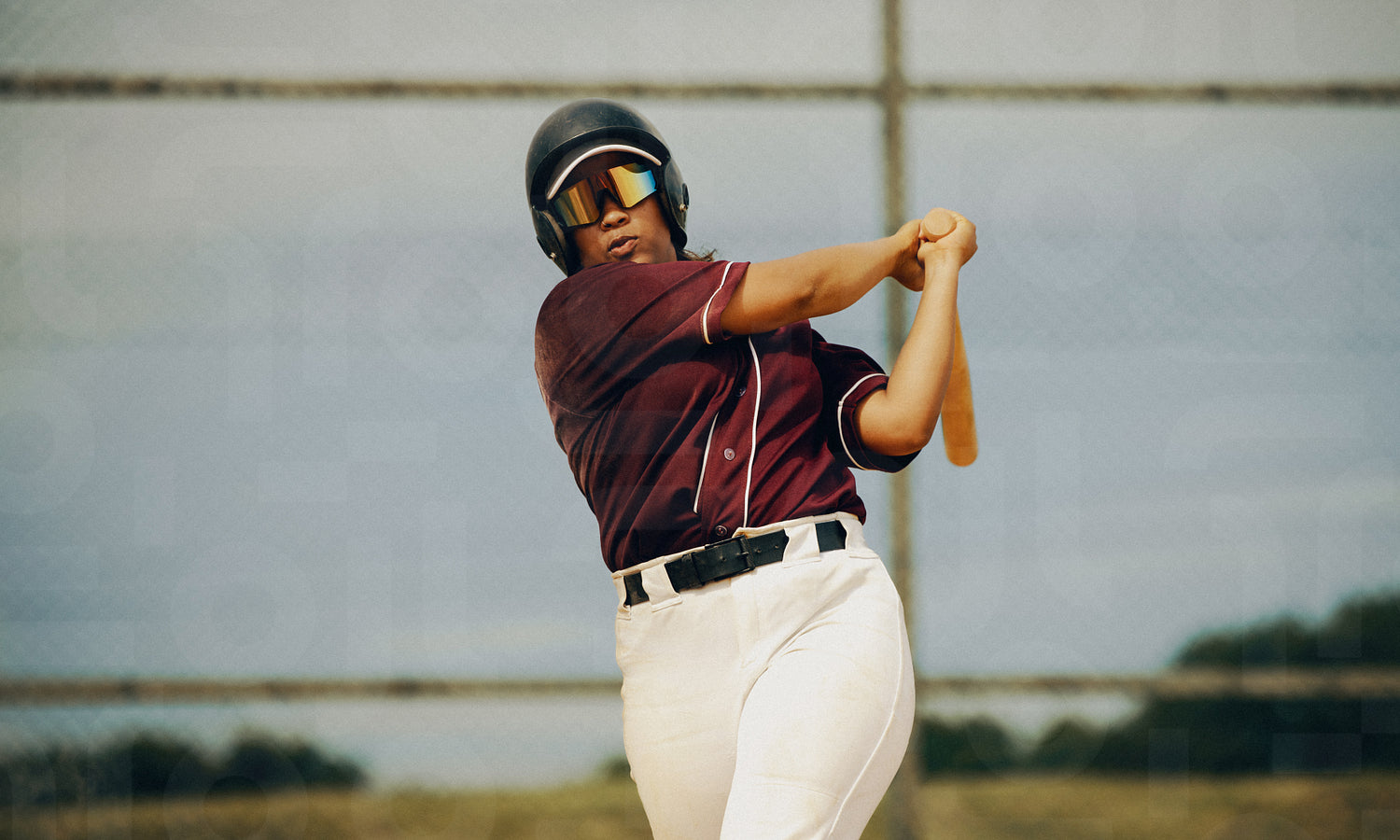 Focused young baseball player swings bat in action on the field, showcasing determination and skill during a sunny game. Athlete wearing maroon baseball jersey hitting a pitch. This photo has intentional use of 35mm film grain.