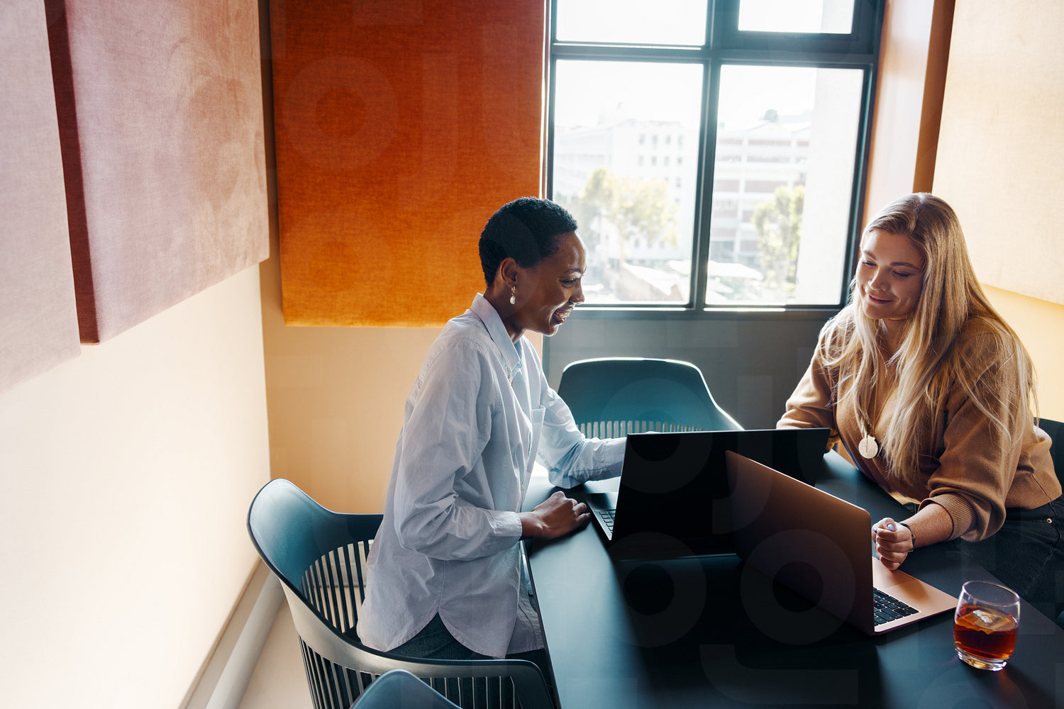Colleagues working together in a modern office setting with laptops