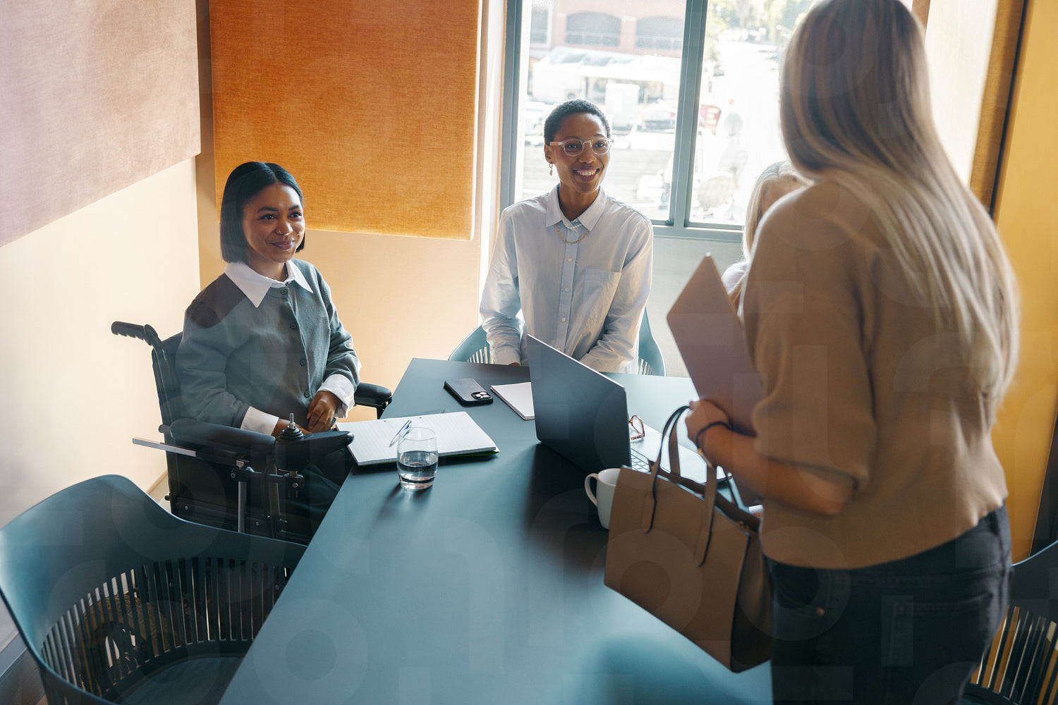 A group of young adults engaging in a professional meeting, fostering teamwork and inclusion.