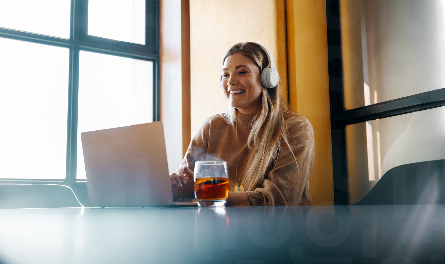 A cheerful young woman wearing headphones works on her laptop at a modern desk, accompanied by a drink, in a well-lit workspace with a relaxed atmosphere.