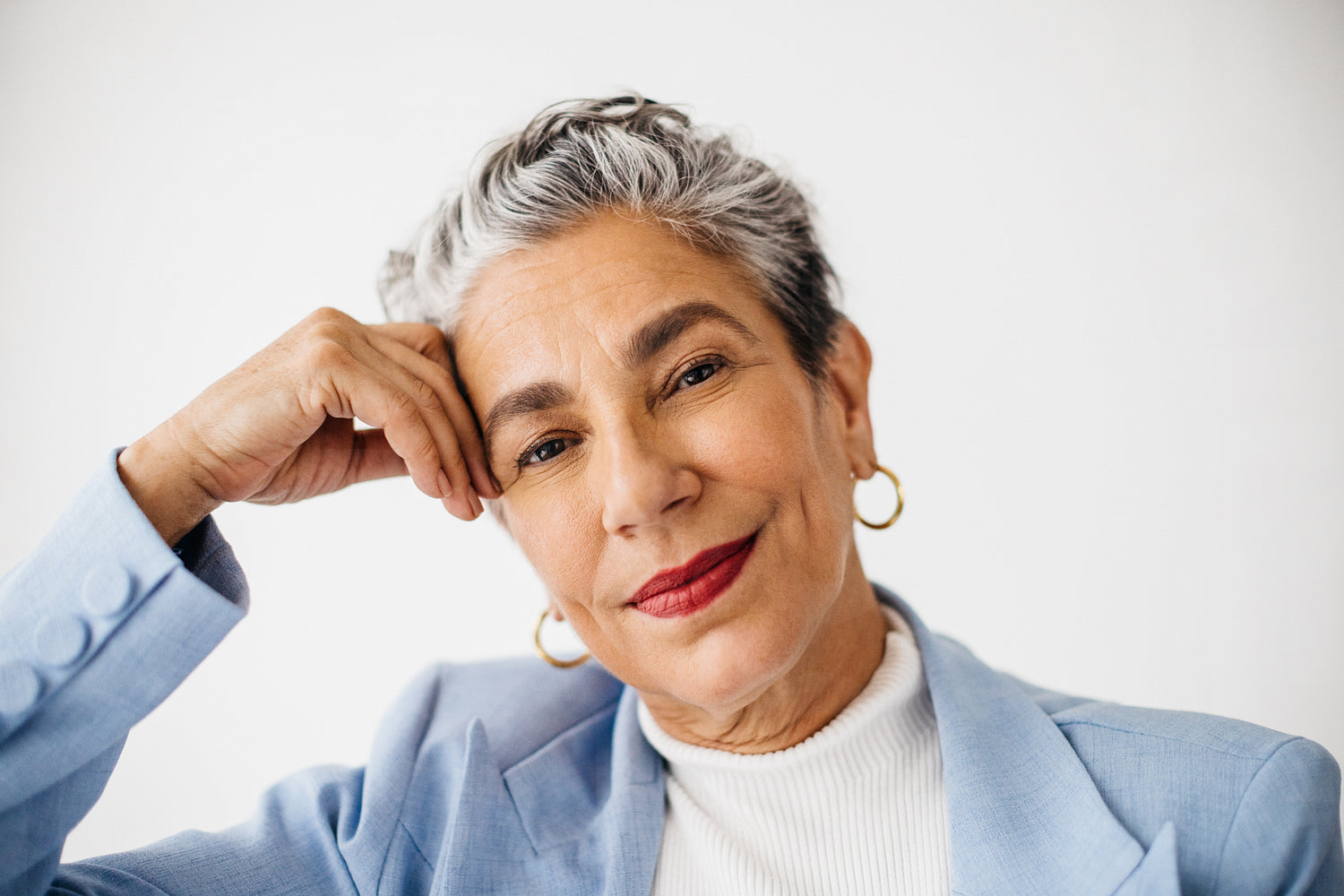Mature business woman looking at the camera with confidence, dressed in a sharp suit and silver hair. Experienced female professional feeling empowered in her role as an accomplished career woman.