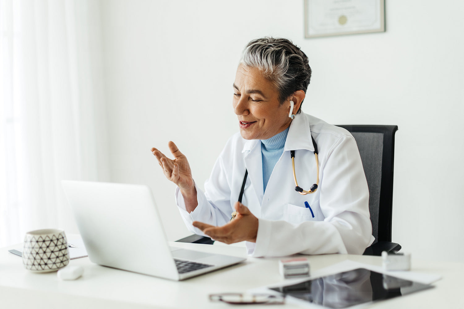Mature doctor practicing telemedicine in her office, consulting a patient on a video call