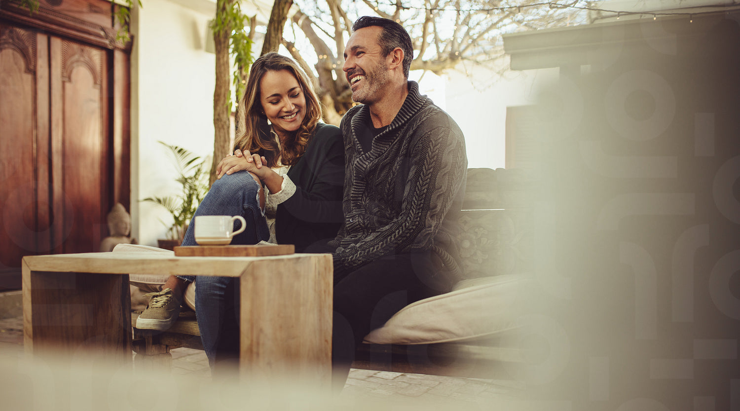 Smiling man and woman sitting at coffee shop. Couple sitting at a cafe during a first date.