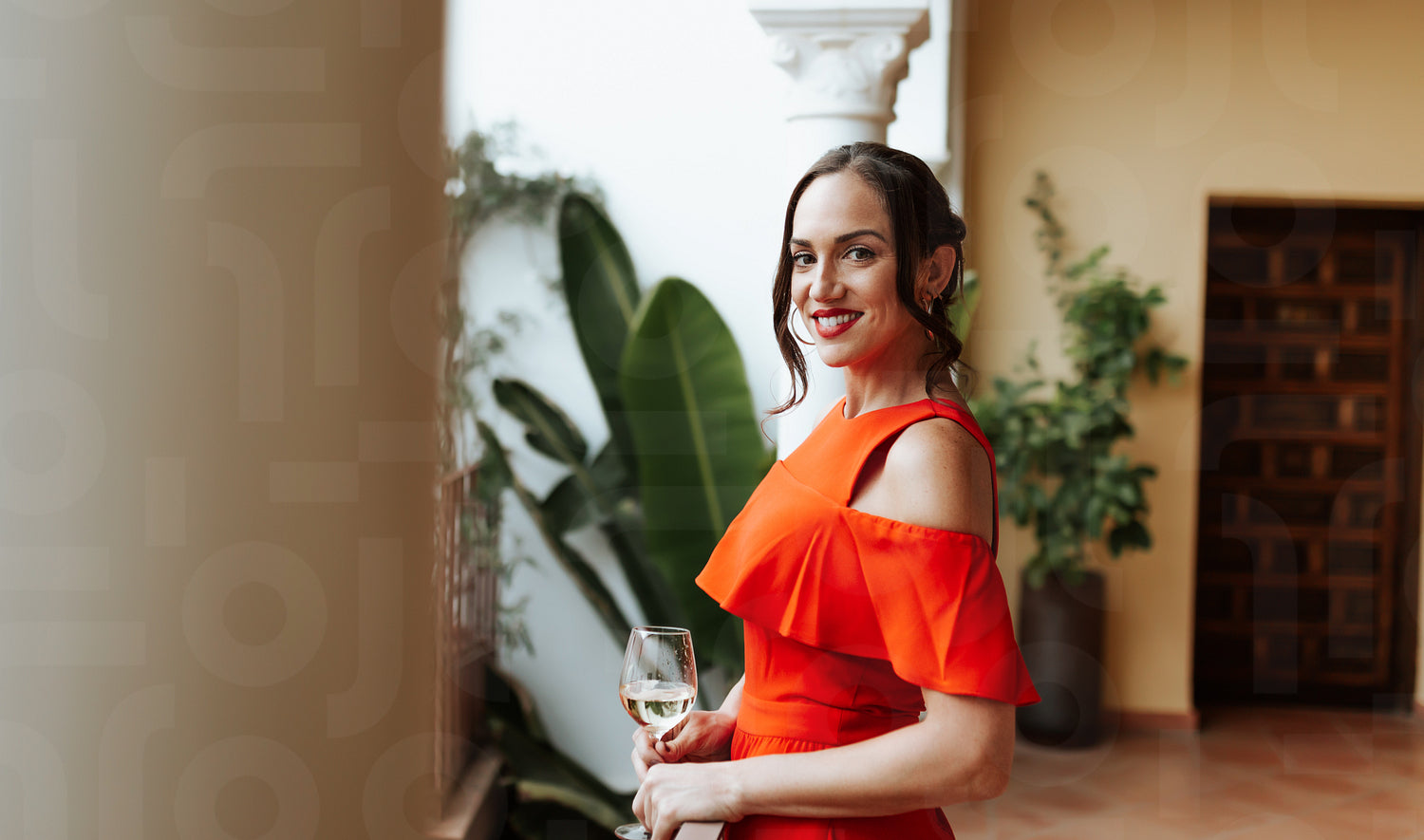 Happy young woman smiling at the camera while standing on a balcony. Carefree young woman having some sparkling wine at a holiday home. Cheerful young woman having a good time on the weekend.