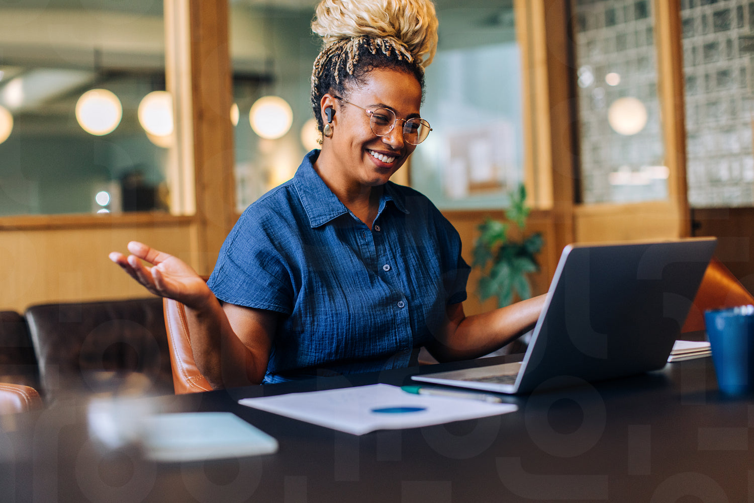 A confident woman in casual attire is engaging with her laptop in an office space, showing a cheerful attitude. The background features a modern setting with a bright and relaxed ambiance.