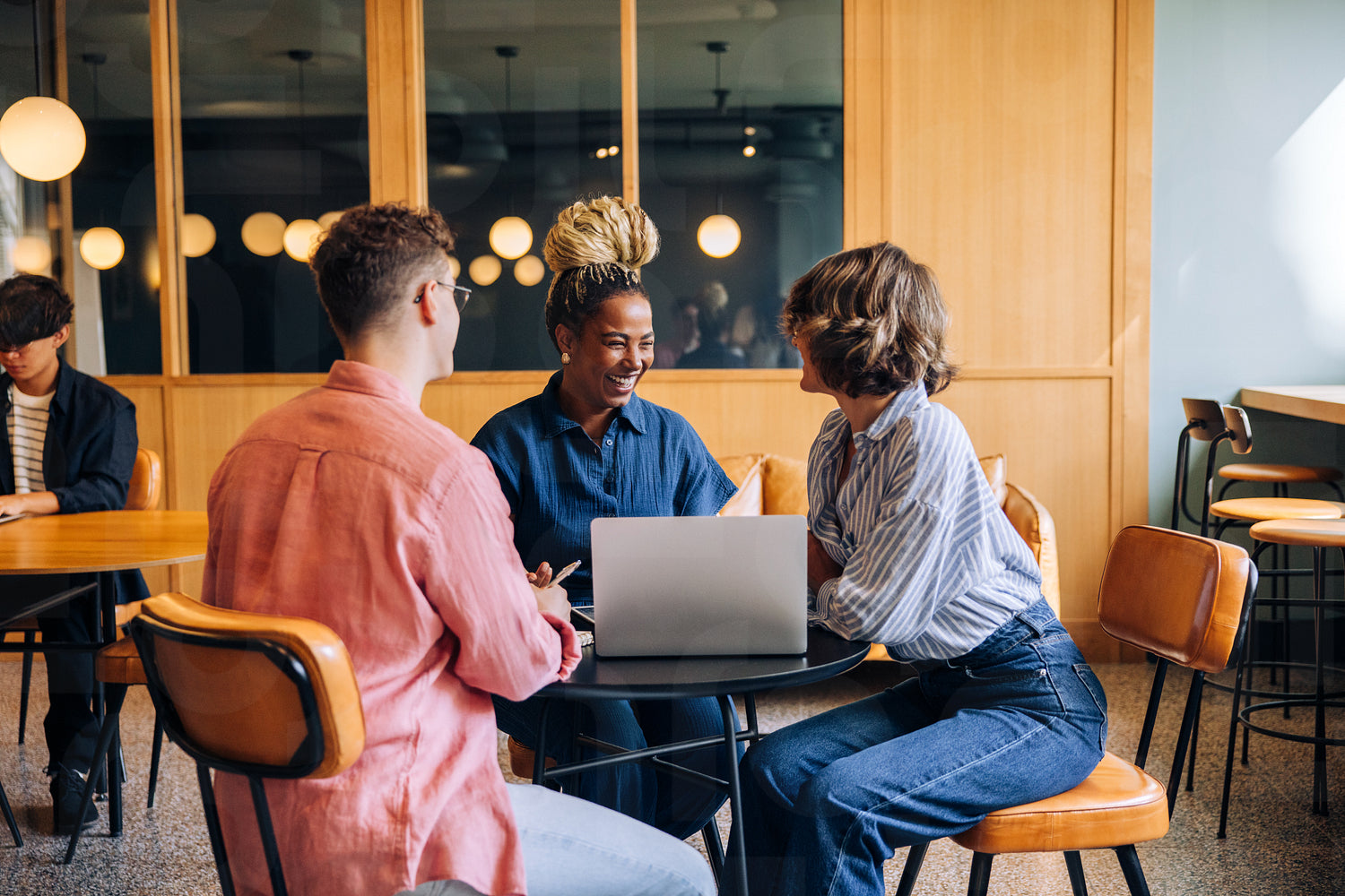 Young coworkers discussing ideas with a laptop in a coworking setting