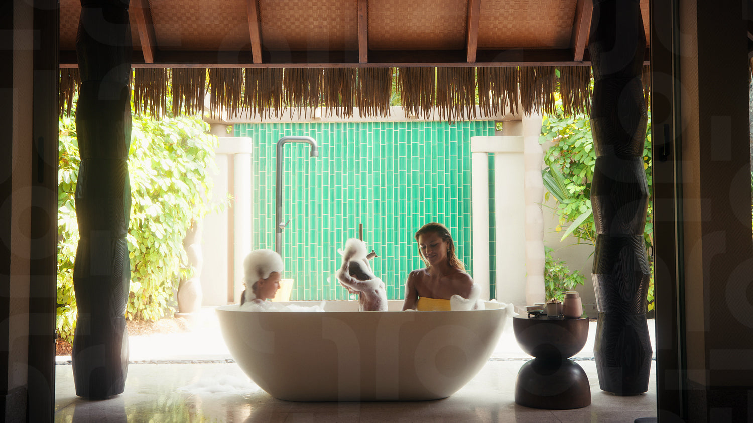 Mother and children enjoy a playful bubble bath during their luxury resort vacation