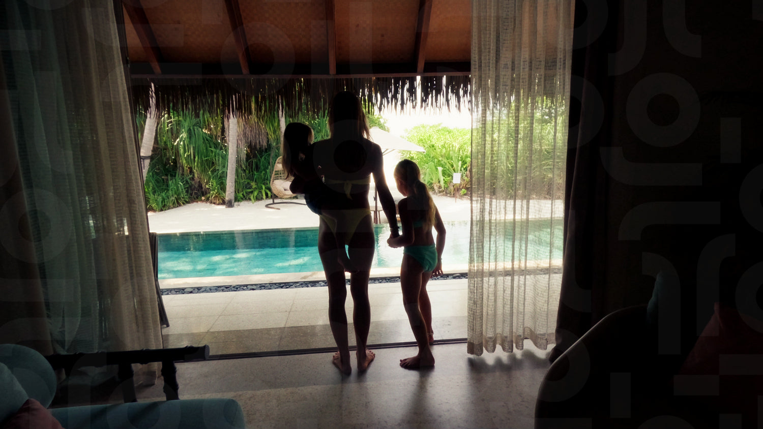 A joyful family of a mother and her children jump into a refreshing private pool at a luxurious island resort. They are on a dream vacation, experiencing happiness and fun together.