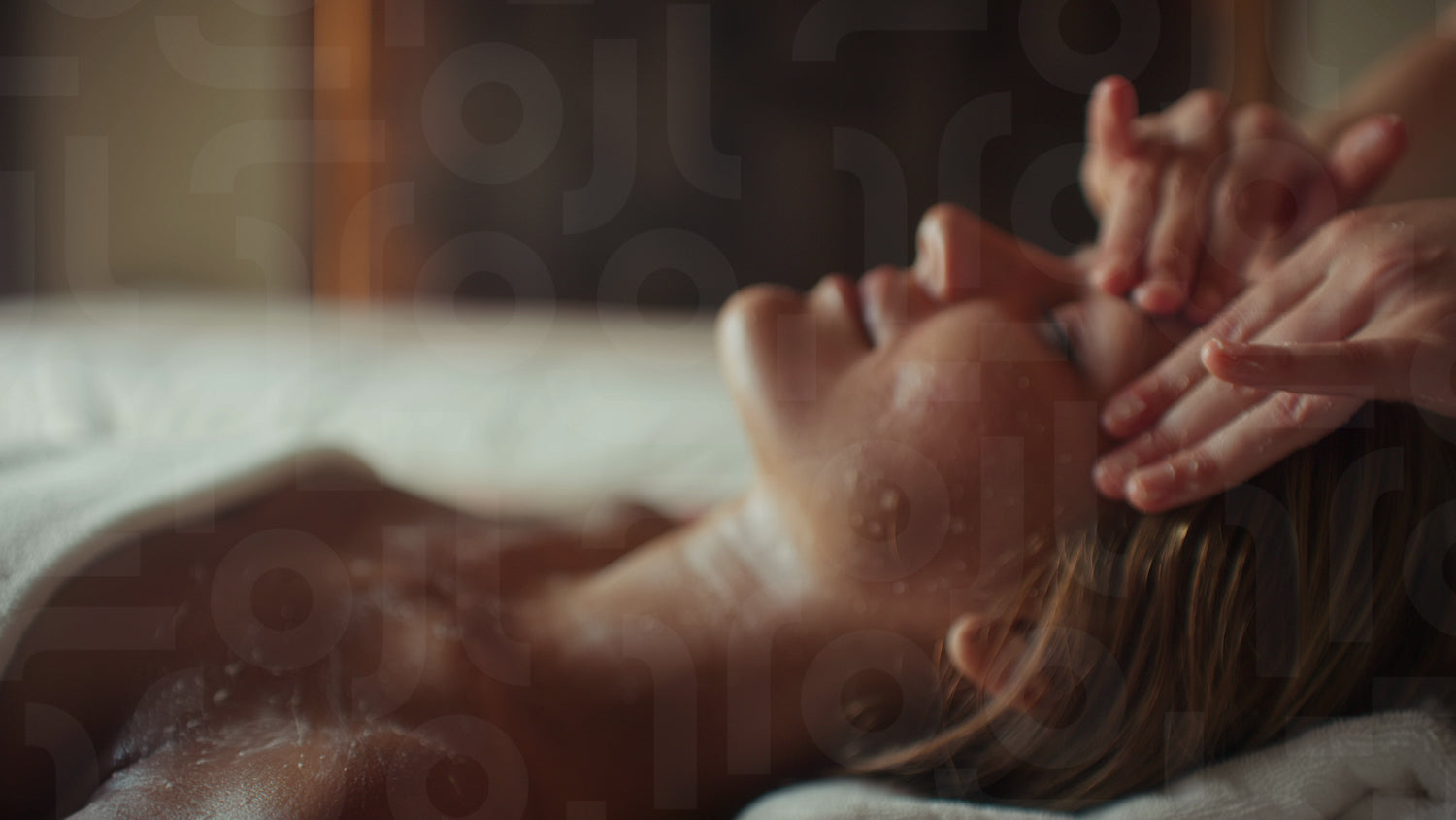 Close-up of a woman receiving a soothing facial massage, her eyes closed in blissful relaxation, promoting beauty, health, and serene well-being