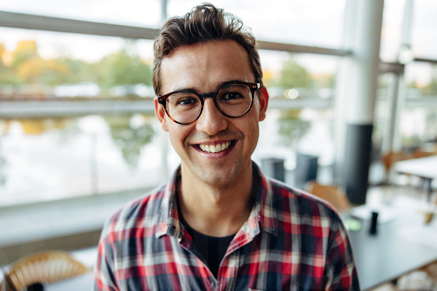Portrait of a cheerful male professional in office. Businessman in casuals wearing eyeglasses looking at camera and smiling.