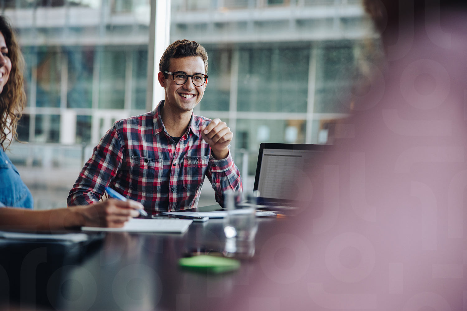 Smiling young man sitting in boardroom meeting. Male professional in meeting with colleagues and smiling,