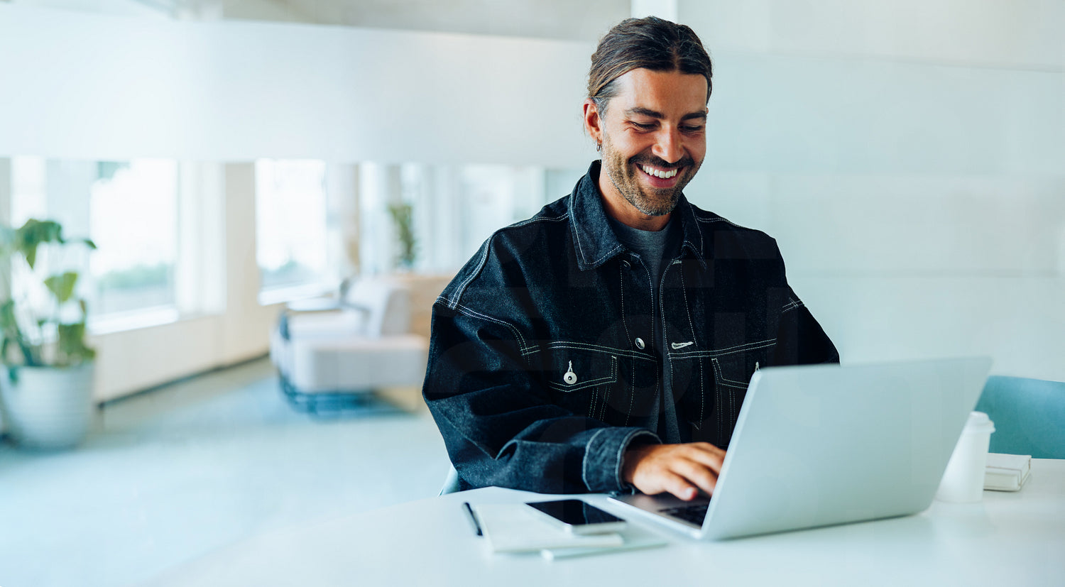 A man in a denim jacket sits at a white desk, smiling while typing on a laptop. A tablet, phone, and coffee cup rest nearby in a modern, open office setting.