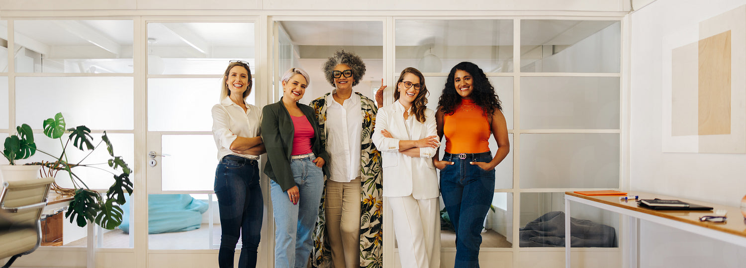 Cheerful businesswomen smiling at the camera while standing together in an office. Group of multicultural businesswomen working as a team in a successful all-female company.