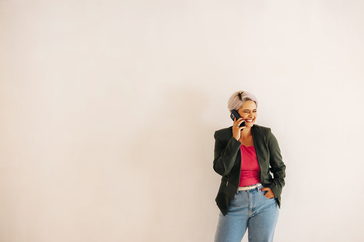 Cheerful young businesswoman smiling happily while taking a phone call. Successful young businesswoman communicating with her business partners in a modern office.