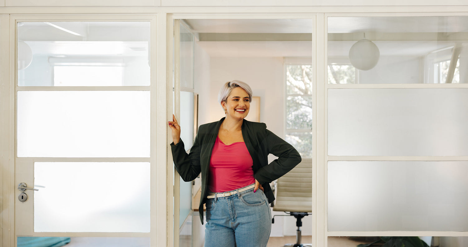 Happy young businesswoman smiling cheerfully while standing in front of her office. Successful businesswoman working in a creative workplace.