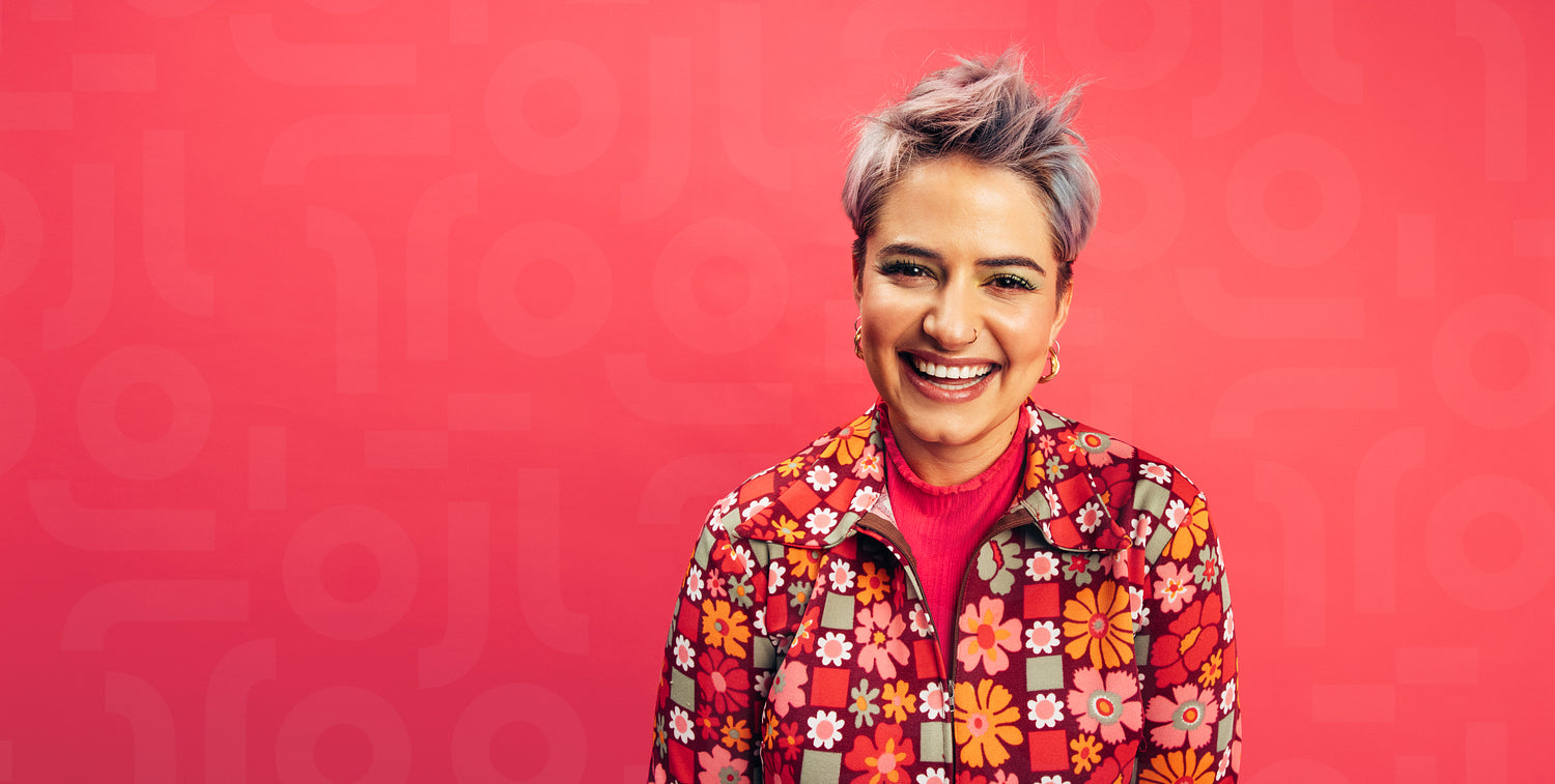 Hipster woman looking at the camera with a happy smile on her face. Cheerful young woman standing alone against a red background. Fashionable young woman with dyed hair feeling vibrant.