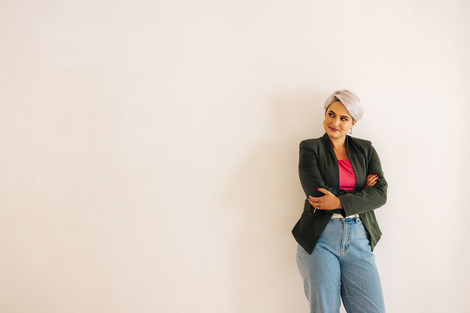 Young businesswoman looking away thoughtfully while standing with her arms crossed. Pensive young businesswoman standing against a wall background in a modern office.