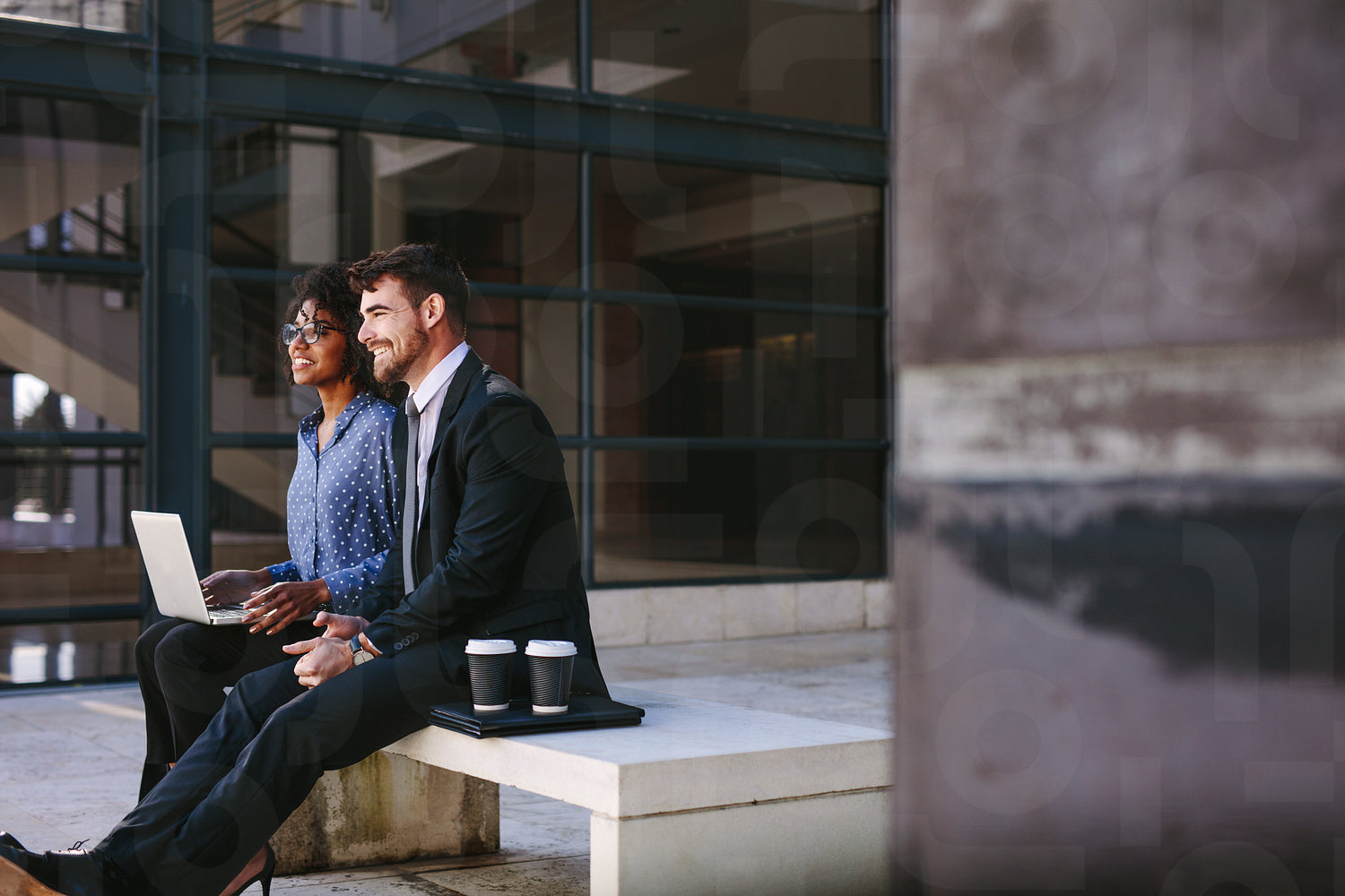 Business colleagues sitting at bench at office lobby with laptop and looking away smiling. Businessman and woman relaxing at office hallway with coffee cups on side.