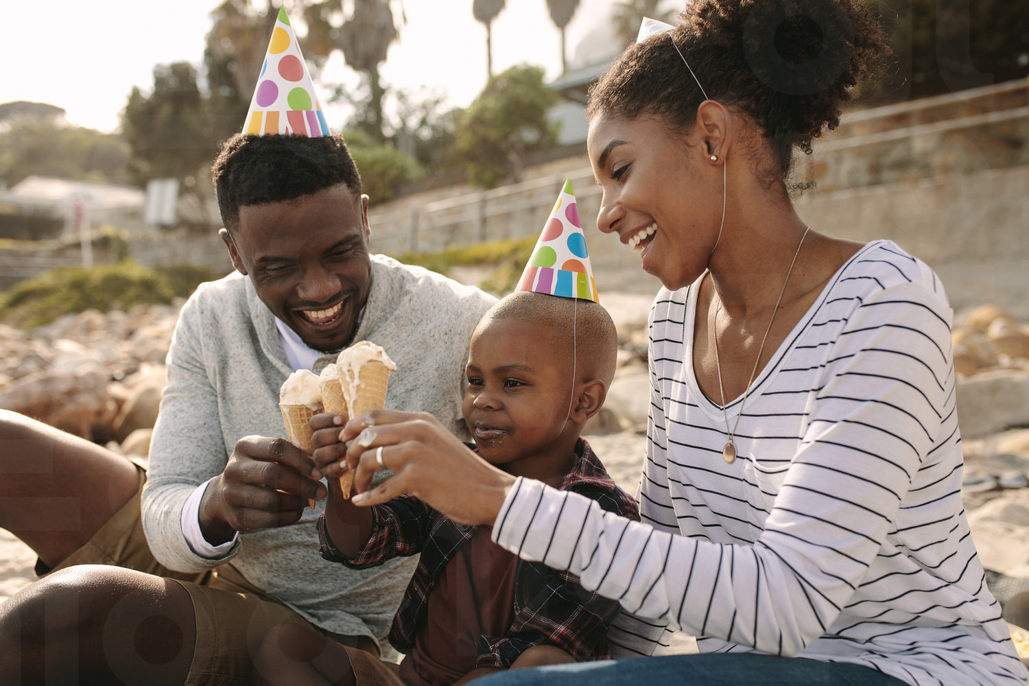 African family with party hats eating ice cream on the beach. Man and woman with son enjoying eating ice-cream. Family enjoying son's birthday with ice cream outdoors.