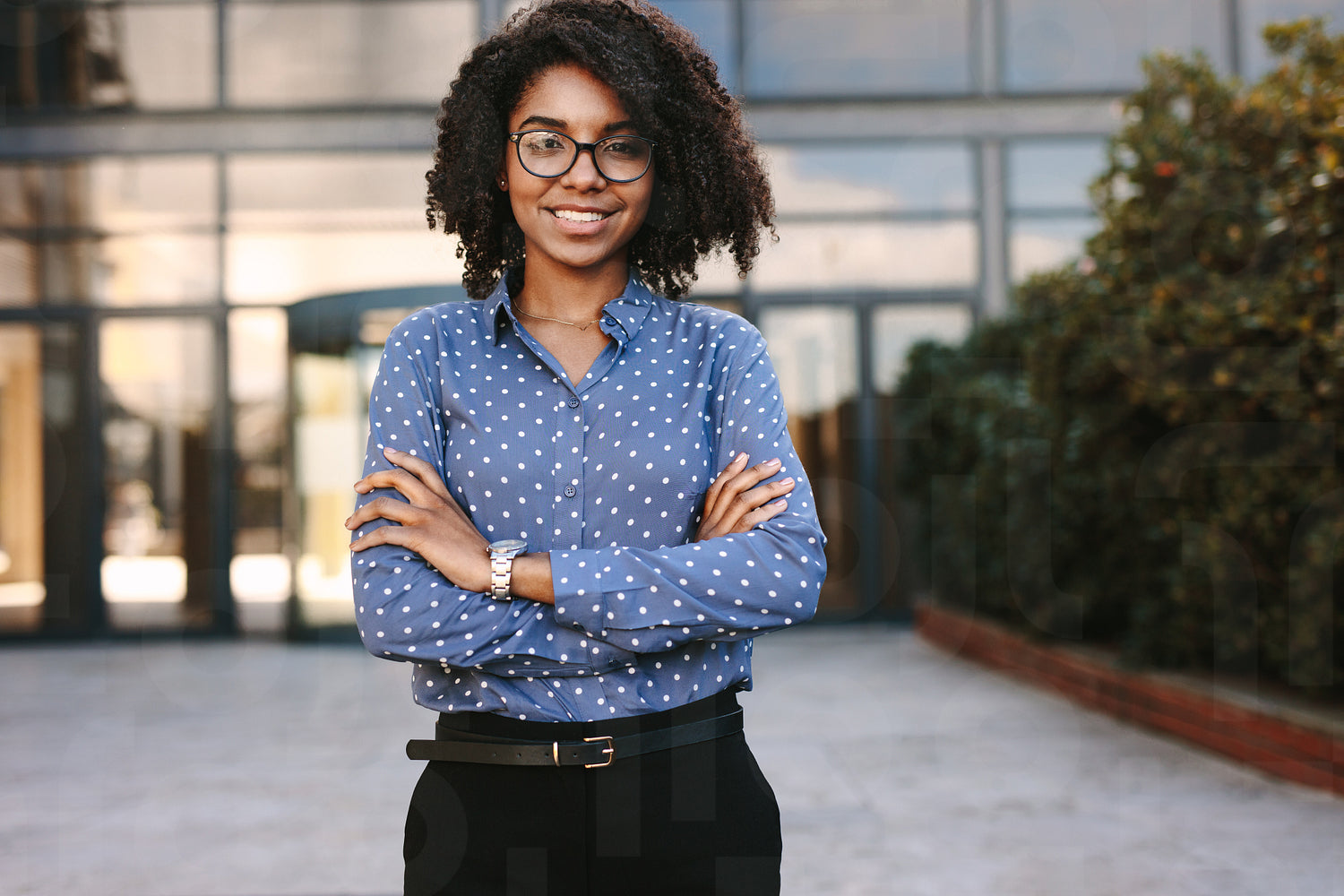 Portrait of positive young african woman standing outside with her arms crossed. Business professional standing confidently with office building in background.
