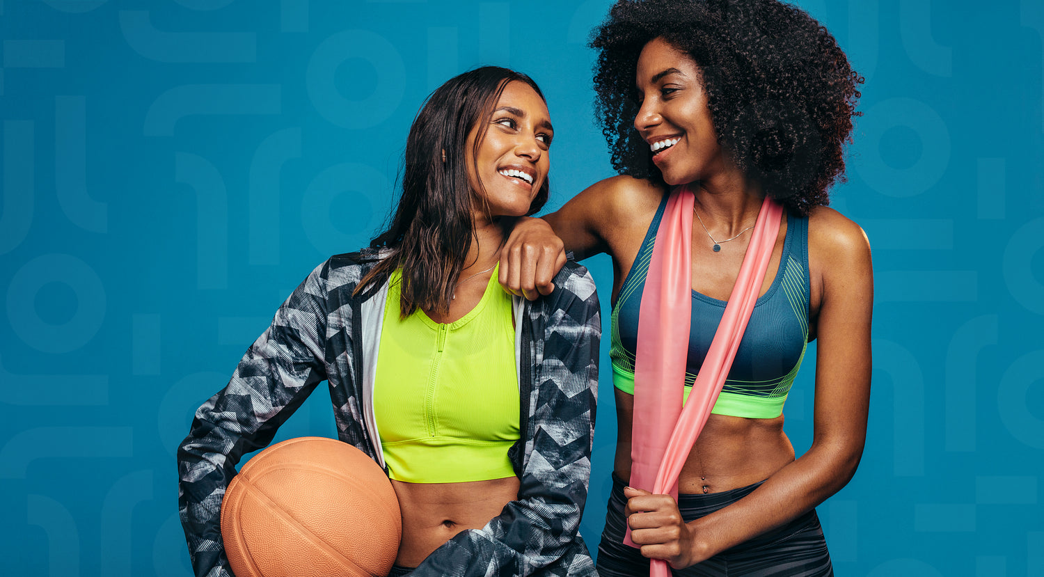 Fitness women relaxing after workout, holding basketball and resistance band. Two fit women taking a break after exercising on blue background, looking at each other and smiling.