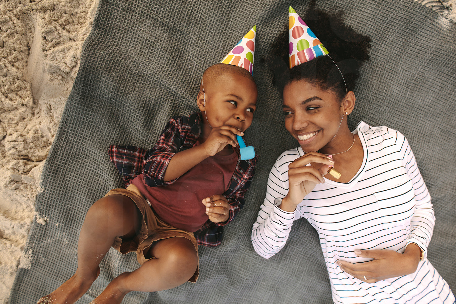 Mother and son wearing party hats lying on the blanket at beach and blowing whistles. Happy family blowing whistle and having fun at beach.