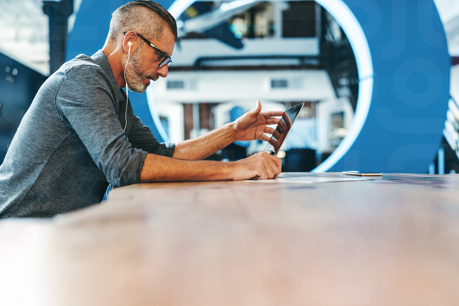 Mature businessman speaking during a virtual meeting in a modern office. Experienced entrepreneur using a laptop for a video conference with his partners. Businessman sitting in a boardroom.