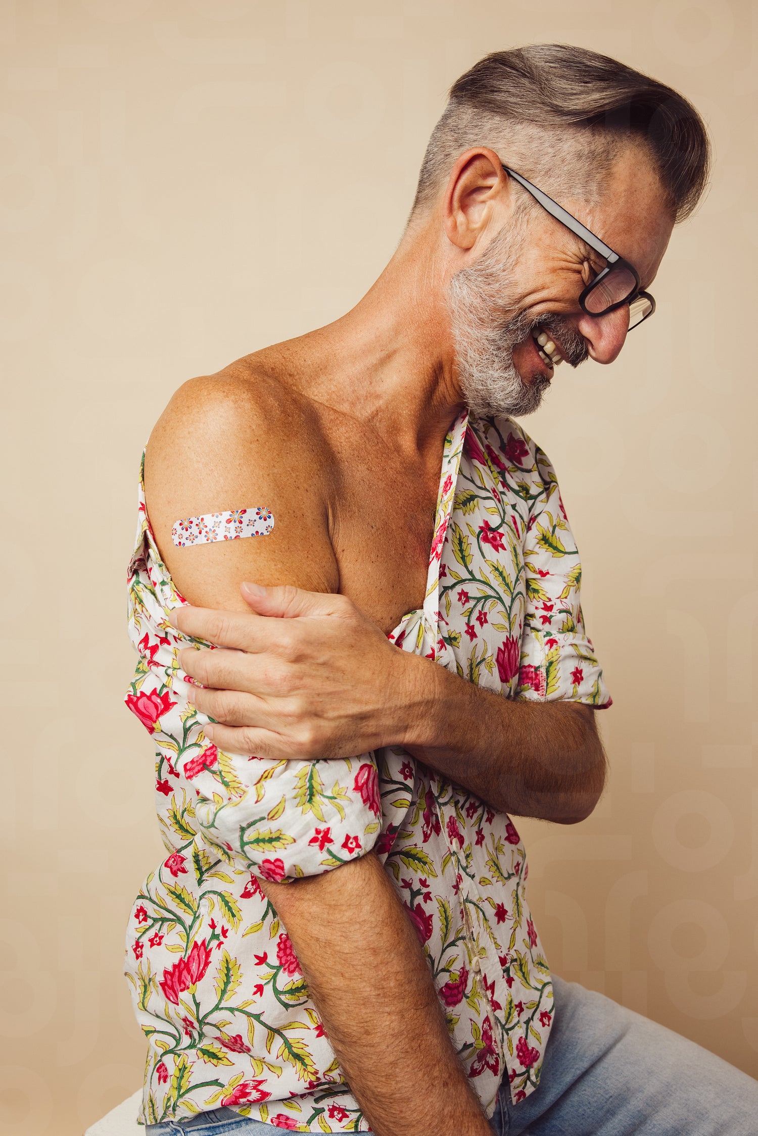 Happy man sitting with bandage on arm after getting vaccination. Mature man showing his arm after receiving covid-19 vaccine.