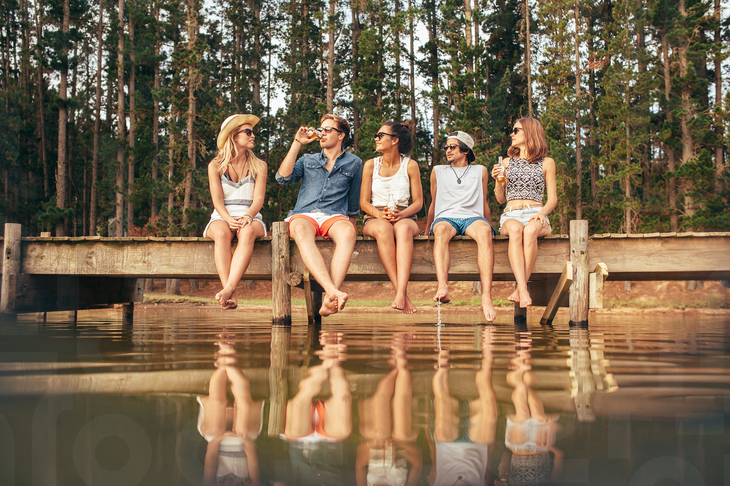 Young people sitting on the edge of a jetty with their hanging down to the water. Group of young friends hanging out at the lake.