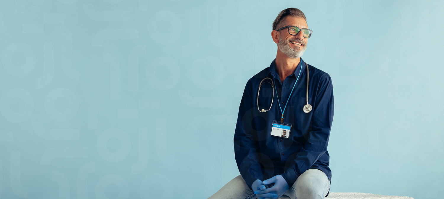 Mature male doctor sitting on a table. Healthcare professional looking away on blue background.