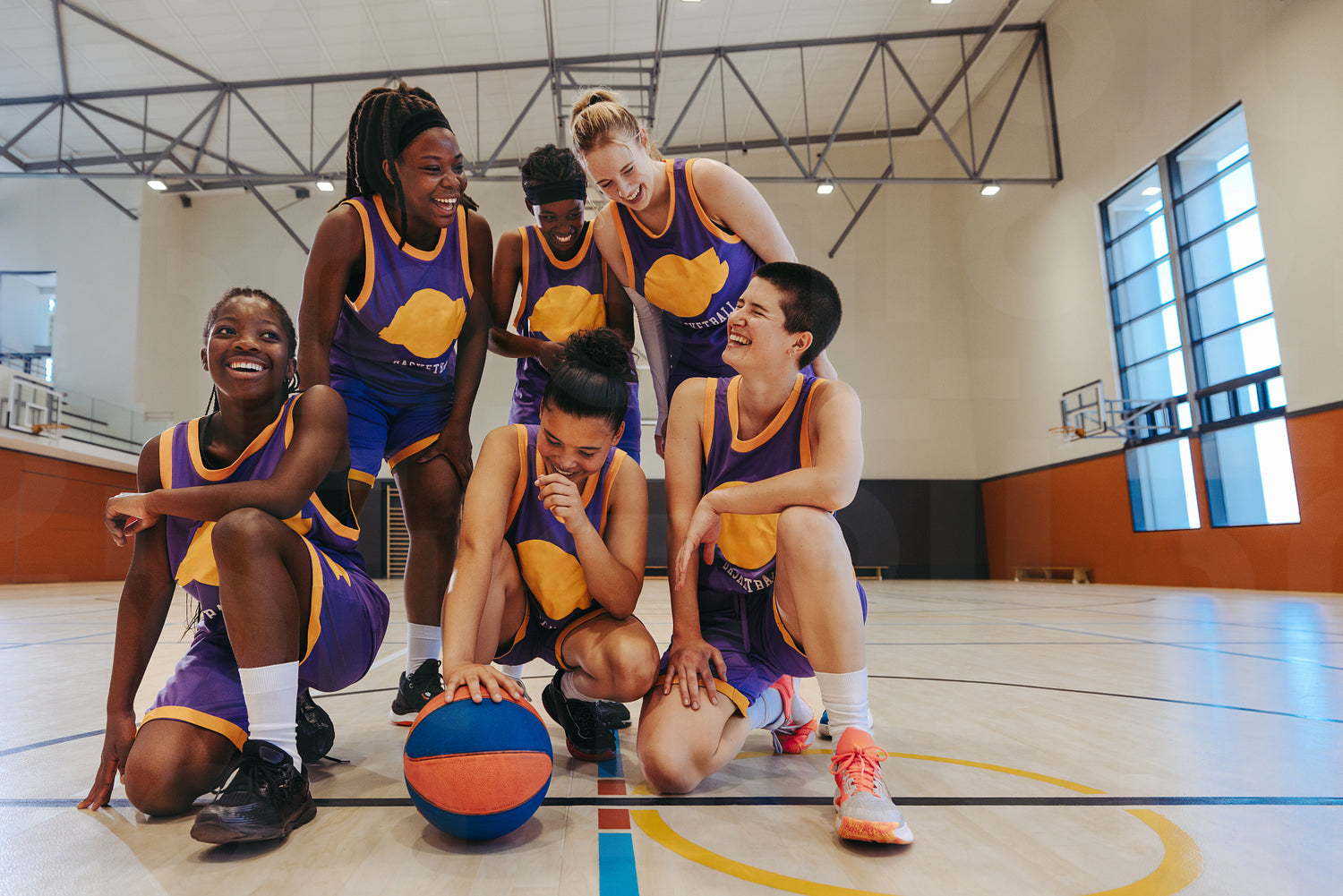 A group of young female basketball players in jerseys having fun and bonding together on a court. The atmosphere reflects teamwork, friendship, and sportsmanship in an indoor sports setting.
