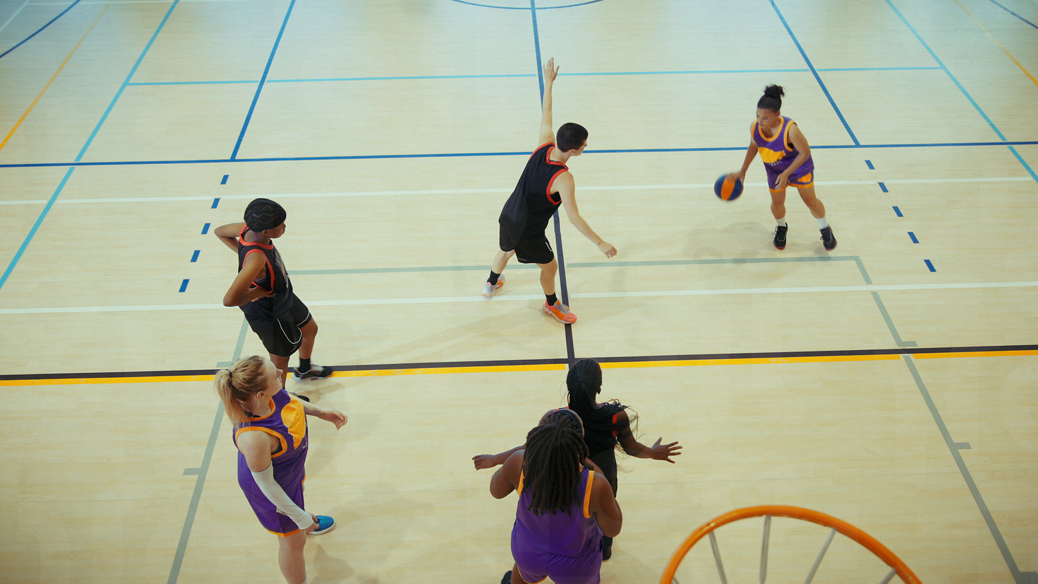 Diverse young athletes enjoy a lively game of basketball on an indoor court. They showcase teamwork and fitness, engaging in active sport for health and fun.