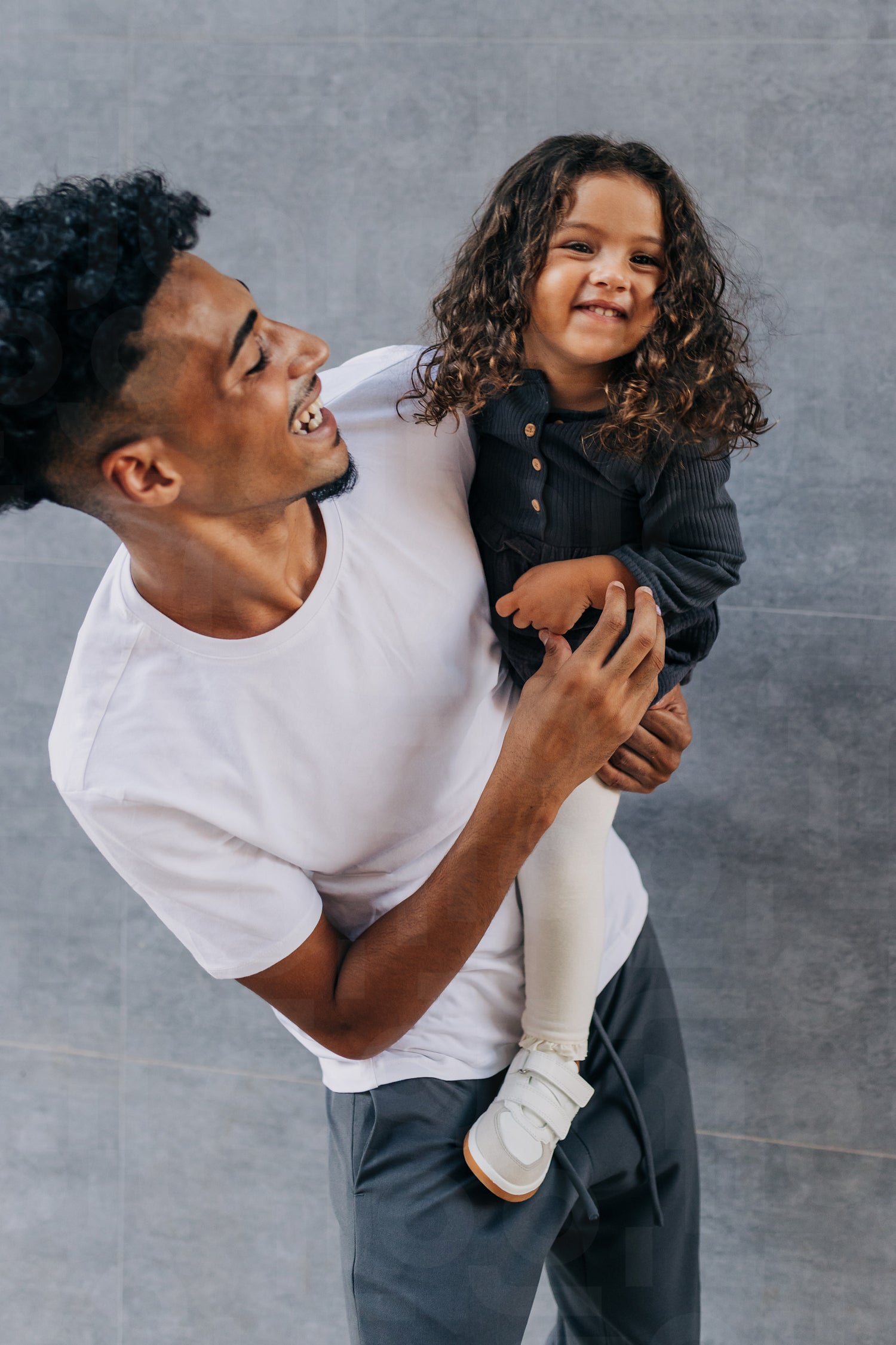 Father and daughter laughing and having fun while standing against a studio background. Happy single father celebrating father's day with his daughter. Father and daughter bonding.