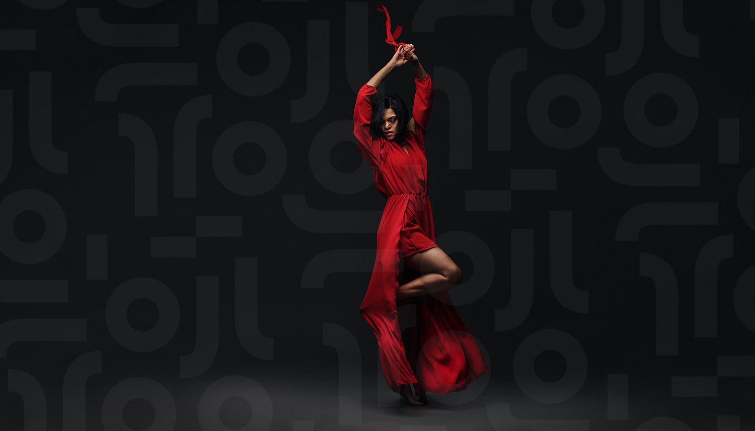 Full length of a young elegant woman dancing contemporary dance. Female in red dress performing strong dance moves over black background.