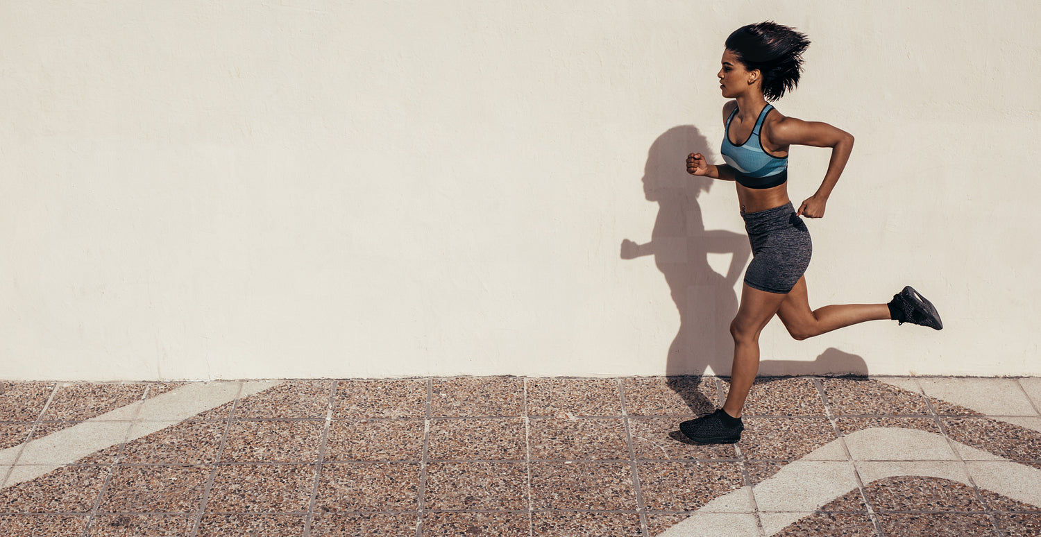 Side view shot of healthy woman athlete running outdoors. Female in sportswear jogging in morning.