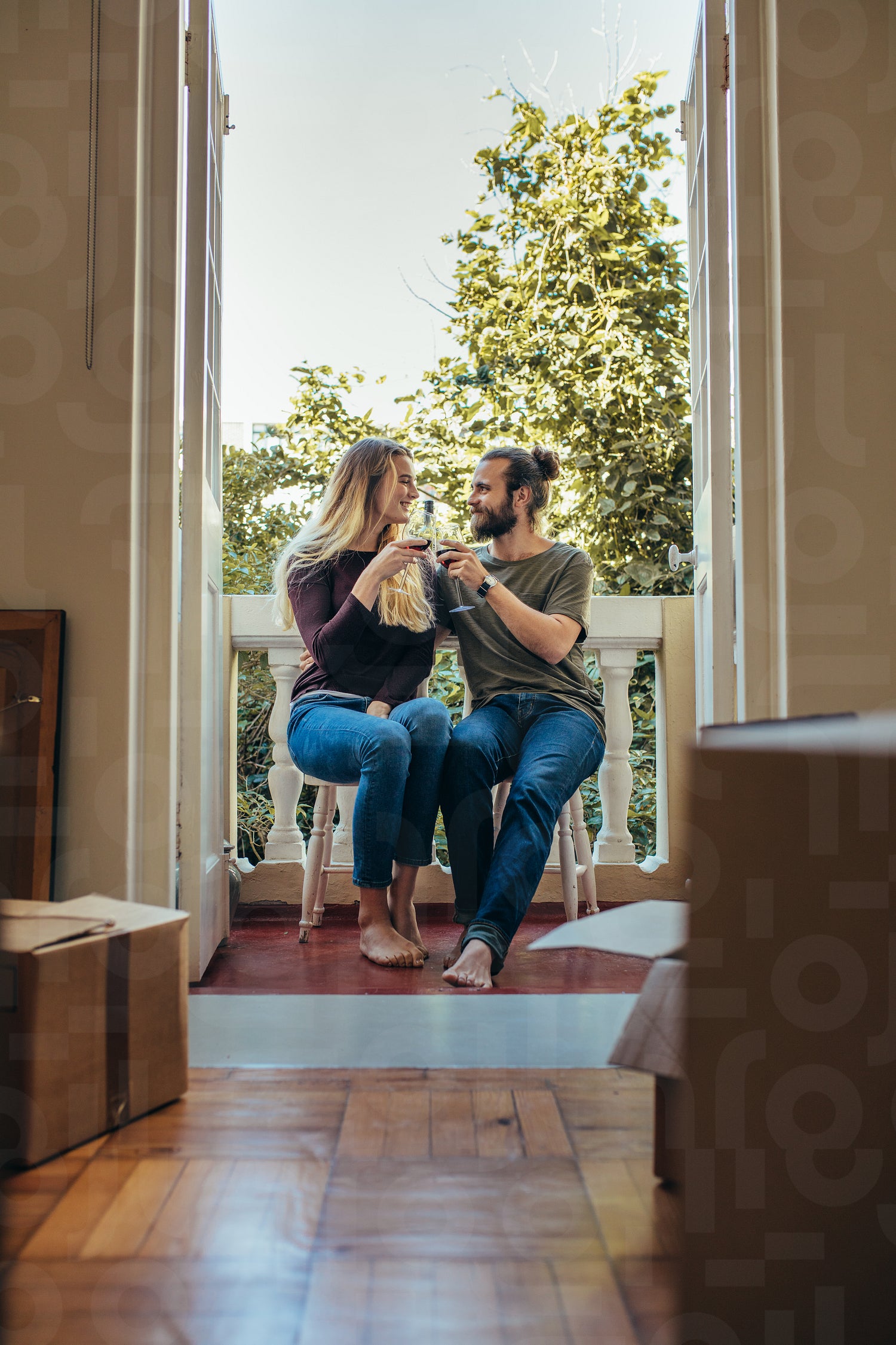 Couple enjoying wine sitting in the balcony of their home. Happy couple moving in to a new home sitting together with packed boxes on the floor.
