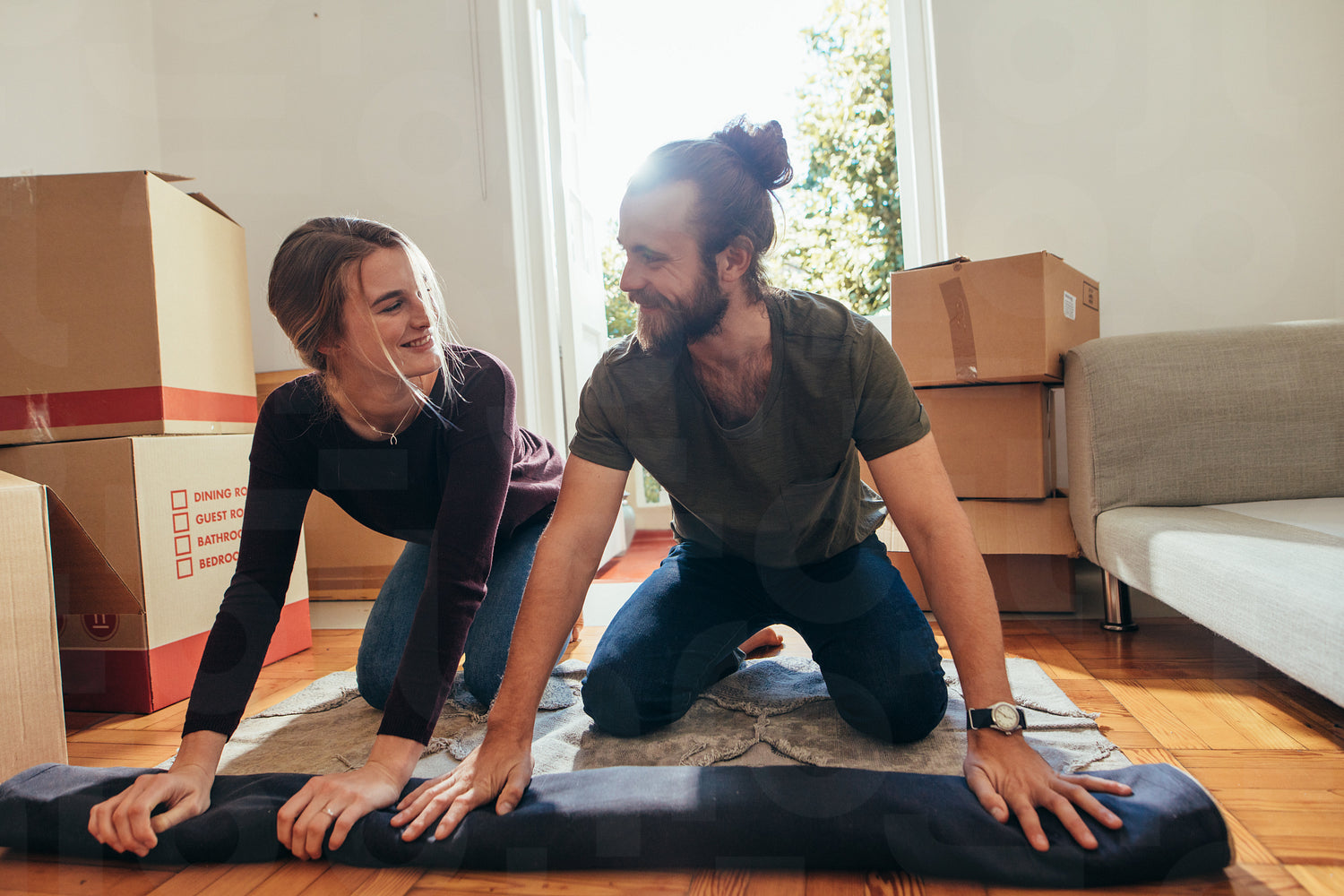 Smiling man and woman sitting on a carpet and rolling it for packing. Couple looking at each other while packing their household items.